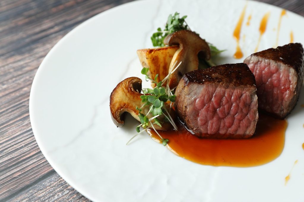 黒毛和牛のモモ肉を使った料理。