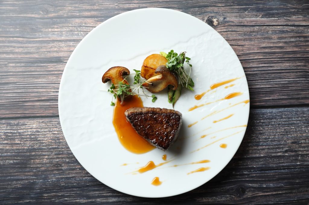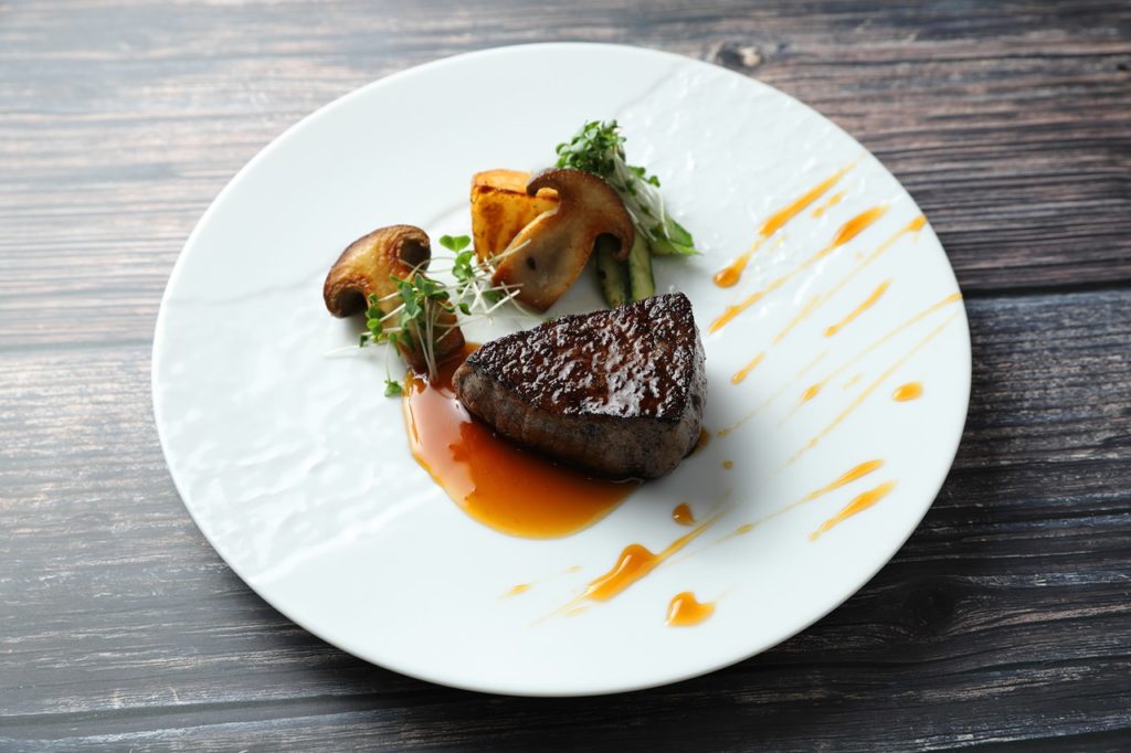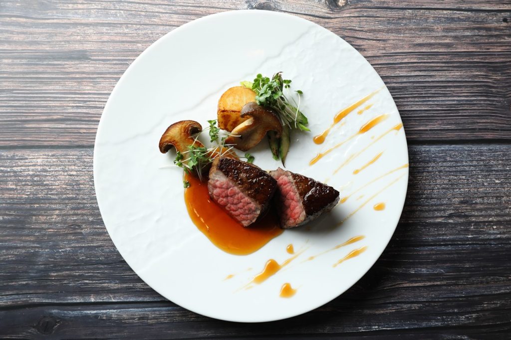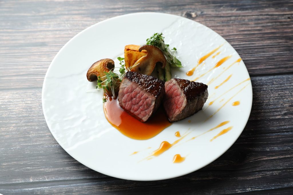 ⑤ジャガイモ、大黒本しめじ、アスパラに火を入れそれぞれ盛り付ける。焼いた肉をのせソースをかけたら完成。