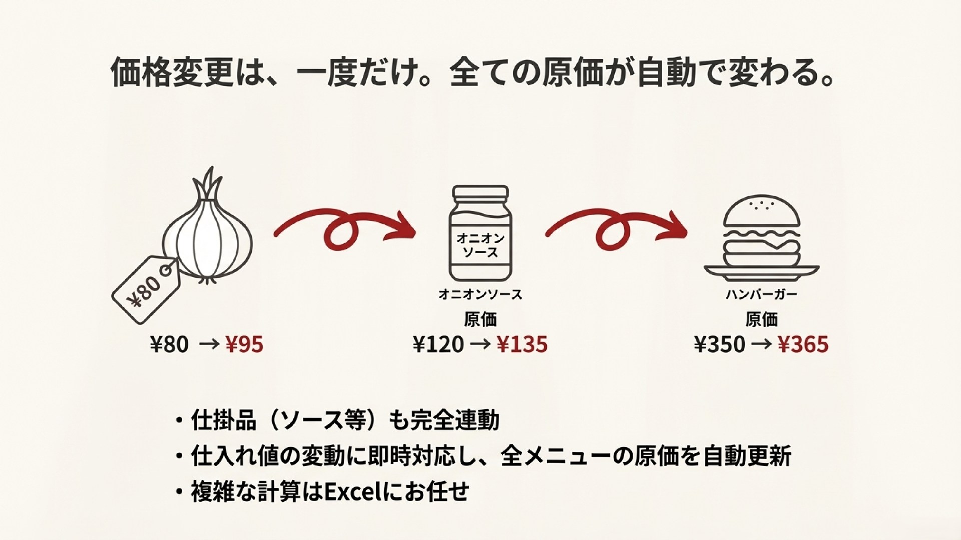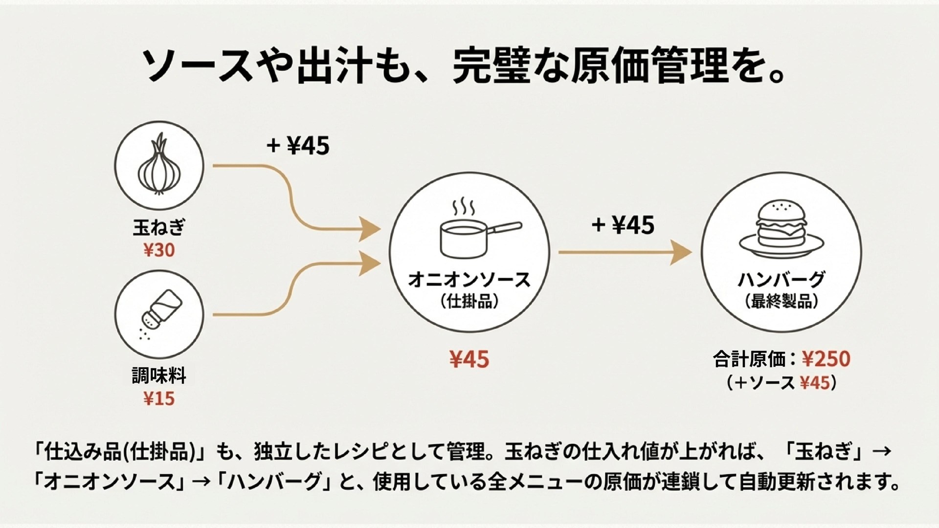 玉ねぎの仕入れ値が上がれば、「玉ねぎ」→「オニオンソース」→「ハンバーグ」と、使用している全メニューの原価が連鎖して自動更新されます。
