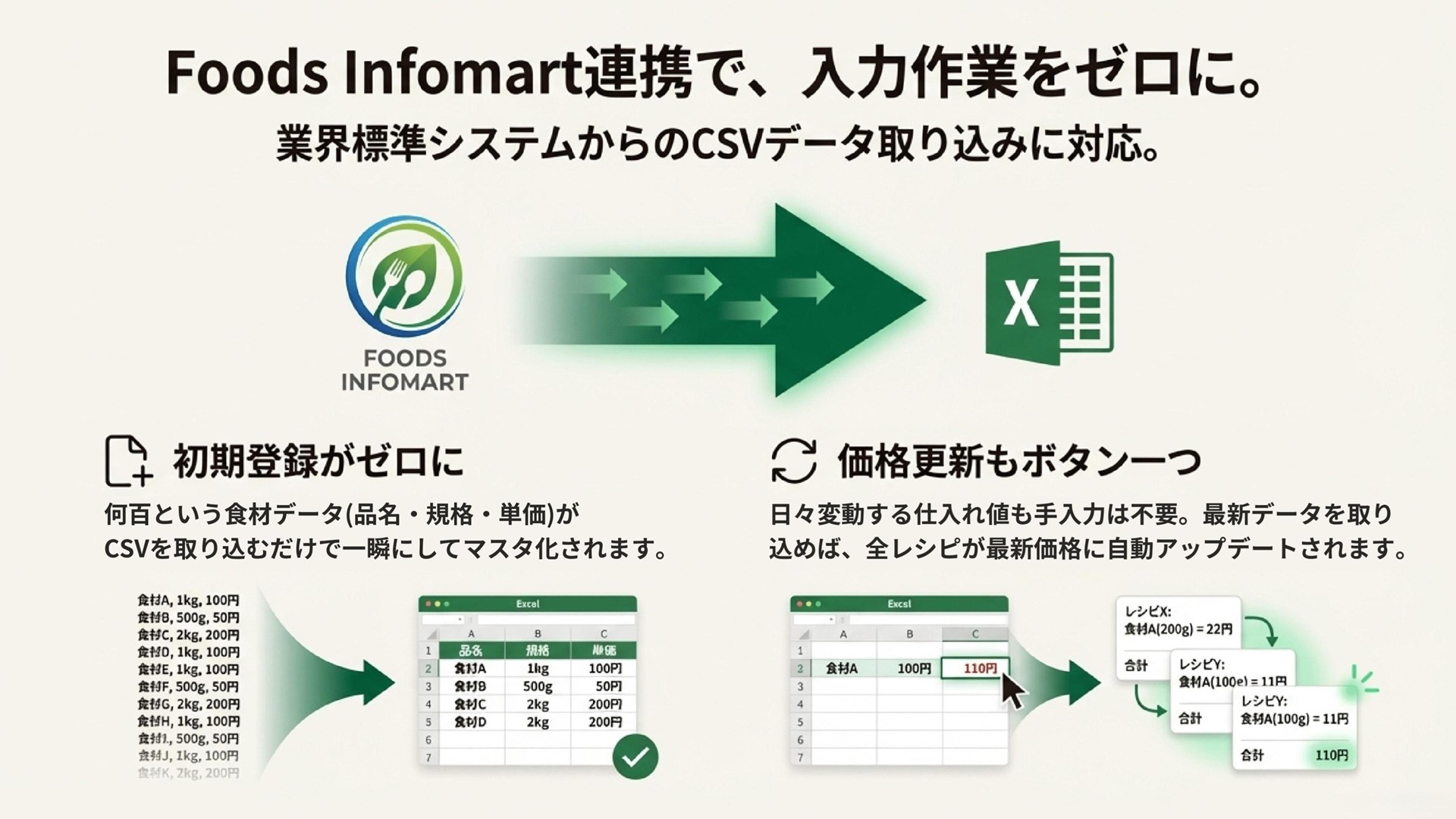 これまで何時間もかけて手打ちしていた食材データ(品名・規格・単価など)が、CSVを取り込むだけで一瞬にしてマスタ化されます。