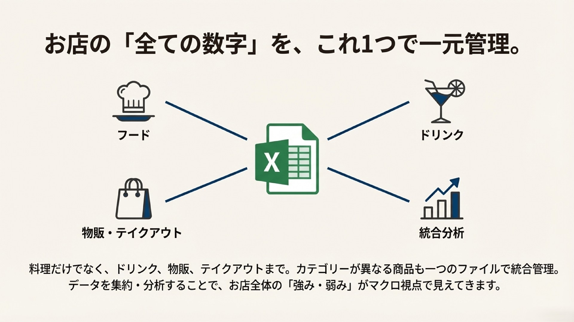 バラバラに管理するのではなく、データを1つに集約・分析することで、お店全体の「強み・弱み」がマクロ視点で見えてきます。